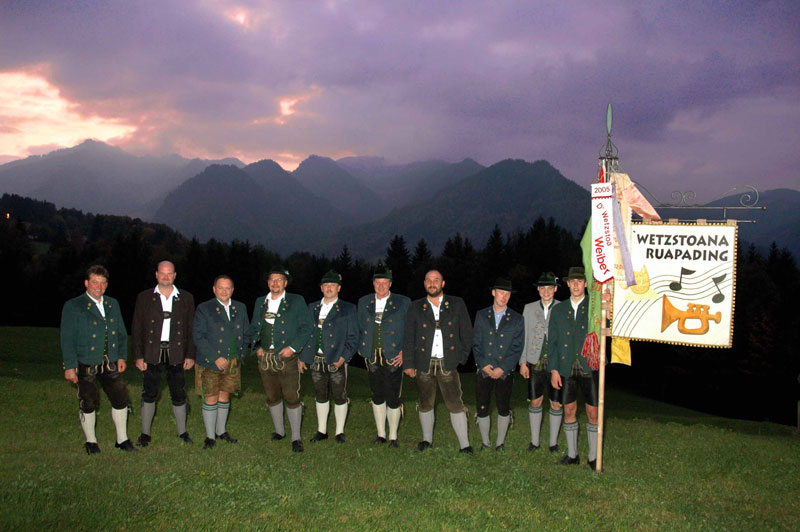 Der Verein "D`Wetzstoana" wurde 1965 im Gasthof Weingarten in Ruhpolding gegründet. Es war kein Zufall, dass an diesem Kirchweihmontag einige junge Ruhpoldinger beim Weindl beisammen saßen, um diesen Tag zu feiern. Die waren nämlich an so manchen "Kirtag-Montag" in den Jahren zuvor auch schon da. Und es ist auch kein Zufall, dass bei solchen Anlässen mitunter die seltsamsten Ideen geboren werden. Wenn Lachen und Lärmen die Wirtsstube erfüllt und dann noch aus dem Radio das Lied vom "Wetzstoa-Hans" zu hören ist, "Mia ham dahoam an oid`n Wetzstoa. Mei Vodda sogt mia soind`n wegdoa. Mei Muadda sogt........", da kann es schon passieren, dass einem wie dem Kastner Hans einfällt, man könne doch einen Wetzstoa-Verein gründen. Und wenn dann auch noch die "g`rechten Leit`" beisammen sind, dann ist es auch kein Zufall, wenn diese Idee unverzüglich in die Tat umgesetzt wird.